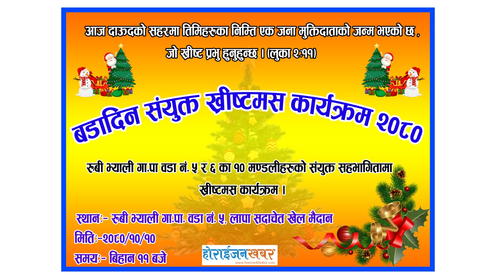 कार्यक्रममा प्रमुख आतिथ्य रुबीभ्याली गाउँपालिका उपाध्यक्ष फेलामा तामाङको सहभागीतामा र प्रमुख बक्ता रुबीभ्याली गाउँपालिका इसाई समाजका अध्यक्ष सुमन घले लगायत पास्टर, अगुवा, इसाई धर्मावलम्बीहरुको भब्य सहभागीतामा कार्यक्रम हुने आयोजक समितिले होराईजन खबरलाई जानकारी दिए ।