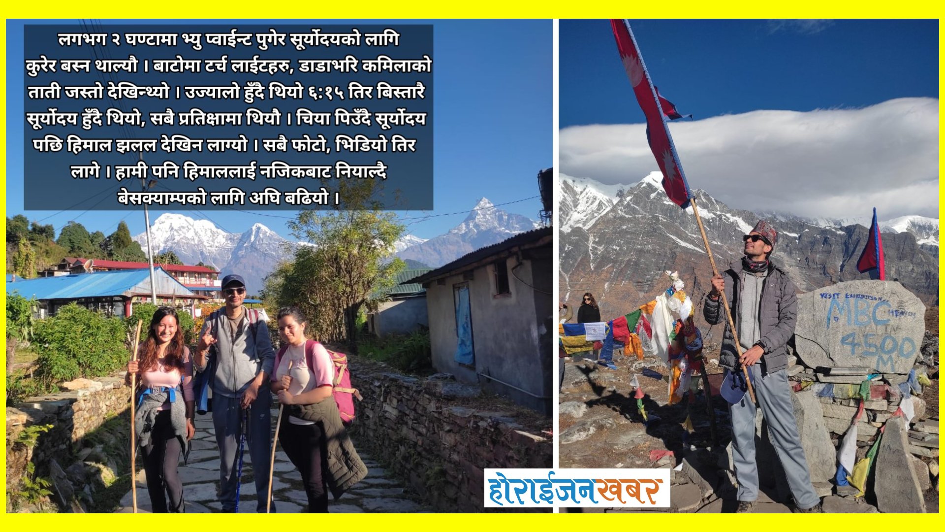 बसपार्कमा बिहान ७ बजे जम्मा भयाै र पाेखराकाे बसकाे टिकट लिएर यात्रा शुरु भयाे । शिखा तिनथाना बाट बस चढिन् । बनिरहेकाे बाटाे सुरुङ्गमार्ग ,मुगलिङ्गपारि पनि बाटाे बनिरहेकाेले बिहान ८ बजे चढेकाे बस पाेखरा पुग्दा लगभग ६ नै बजिसकेकाे थियाे । त्याे दिन पाेखरा नै बसेर भाेलिपल्ट बिहानै ५ बजे ट्याक्सी लिएर पाेखरा ,बागलुङ्ग सडकखण्डमा पर्ने कांडेमा उत्रियाै लगभग ७ बजिसकेकाे थियाे । त्यहाँ चिया नास्ता खाएर यात्रा अघि बढ्याे । लगभग डेढ घण्टाकाे यात्रा पछि अष्ट्रेलियन बेसक्याम्प पुग्याैं। हिमालकाे सुन्दर दृश्य अ‍ाँखा अघि देख्दा मन नै पुलकित भयाे । एकछिन हिमाल नियाल्दै फेरि अघि बढियाे ।अर्काे स्थान पाेथाना पुग्याैं । त्यसपछि फेरि एक घण्टा ४५ मिनेटमा टाेल्का पुगियाे । विश्राम गर्दै यात्रा जारी थियाे त्यसपछिकाे स्थान पितम देउराली (२१०० मि.) पुग्याै ।त्यसपछि दूधखर्क (२५५० मि.) ,मुसलबारी,काेकर ( फरेष्ट क्याम्प २५५० मि.) ,चुप्रुङ्ग हुँदै लगभग डेढ घण्टामा रेष्ट क्याम्प (२६०० मि.) गएर पहिलाे दिनकाे पदयात्रा टुङ्गियाे । हाेटल गाेल्डेन भ्युमा बास बसियाे । राति अन्य साथीभाईहरुसंग गीत गाउँदै ,अ‍ागाे ताप्दै रमाईलाे भयाे ।भाेलिपल्ट बिहान चिया ,नास्ता गरेर ८ बजेतिर माथि उक्लन थाल्याै। केही बेर पछि कमकिकु (२७५० मि.) पुगियाे । रेष्टक्याम्पबाट लगभग १ घण्टामा बादलडाडा (३३०० मि.) पुग्दा त मन अति खुशी अ‍ाँखा अगाडि झलल हिमाल टल्कने नाम अनुसार फेरि एकैछिनमा बादलले छाेप्ने अति अ‍ानन्ददायक पल थियाे । त्यसपछि हाम्राे दाेस्राे दिनकाे गन्तव्य हाई क्याम्प (३५५० मि.)पुग्याै दिउसाे २ बजेतिर लगभग ५ घण्टाकाे निरन्तर यात्रापछि। चिसाे माैसम थियाे हामी भित्र नै गफमा मस्त ,बाहिर अ‍ाकाश खुल्नासाथ हिमाल हेर्न फाेटाे खिच्न हतपत बाहिर निक्लियाै। छिनमै फेरि हरायाे हिमाल देखिन छाेड्याे ।त्याे दिन ६ बजेतिर नै खाना खाएर सुत्न काेठामा गईयाे। चिसाे माैसम खासै निन्द्रा परेन राति ३ बजे नै उठेर हामी बेसक्याम्पकाे लागि अघि बढ्याै ।लगभग २ घण्टामा भ्यु प्वाईन्ट पुगेर सूर्याेदयकाे लागि कुरेर बस्न थाल्याै।बाटाेमा टर्च लाईटहरु डाडाभरि कमिलाकाे ताती जस्ताे देखिन्थ्याे ।उज्यालाे हुँदै थियाे ६:१५ तिर बिस्तार सूर्याेदय हुँदै थियाे सबै प्रतिक्षामा थियाेै।चिया पिउँदै सूर्याेदय पछि हिमाल झलल देखिन लाग्याे । सबै फाेटाे,भिडियाे तिर लागे ।हामी पनि हिमाललाई नजिकबाट नियाल्दै बेसक्याम्पकाे लागि अघि बढियाे। लगभग डेढ दुई घण्टामा माथि मर्दी बेसक्याम्प पुगियाे ।४५५० मिटरमा रहेकाे बेसक्याम्पबाट अ‍ाँखा अगाडि माछापुच्छ्रे,अन्नपूर्ण ,मर्दी हिमाल देख्दा मन अति अ‍ानन्दित बनायाे । १ घण्टा त्यही दृश्य नियाल्दै 