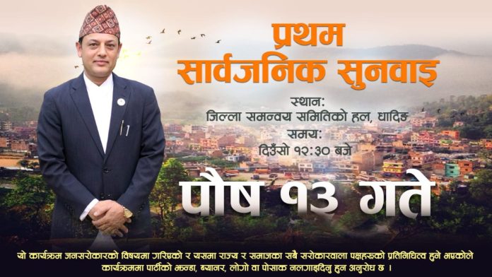 काठमाडौँ । राष्ट्रिय स्वतन्त्र पार्टीका उपसभापति एवं प्रतिनिधिसभा सदस्य डोलप्रसाद अर्यालले धादिङमा पहिलोपटक सार्वजनिक सुनुवाइ गर्ने भएका छन् । सार्वजनिक सुनुवाइ पुस १३ गते दिउँसो साढे १२ बजे जिल्ला समन्वय समितिको हलमा हुने भएको हो ।
