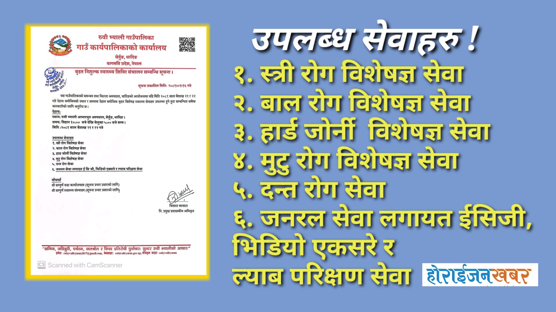 बिहान १० बजे देखि बेलुका ५ बजे सम्म २ दिन संचालन हुने उक्त शिविरमा स्त्री रोग विशेषज्ञ सेवा, बाल रोग विशेषज्ञ सेवा, हार्ड जोर्नी विशेषज्ञ सेवा, मुटु रोग विशेषज्ञ सेवा, दन्त रोग सेवा, जनरल सेवा लगायत ईसिजी, भिडियो एकसरे र ल्याब परिक्षण सेवा उपलब्ध हुने गाउँपालिकाले एक सुचना प्रकाशन गर्दै जानकारी गराइएको छ ।