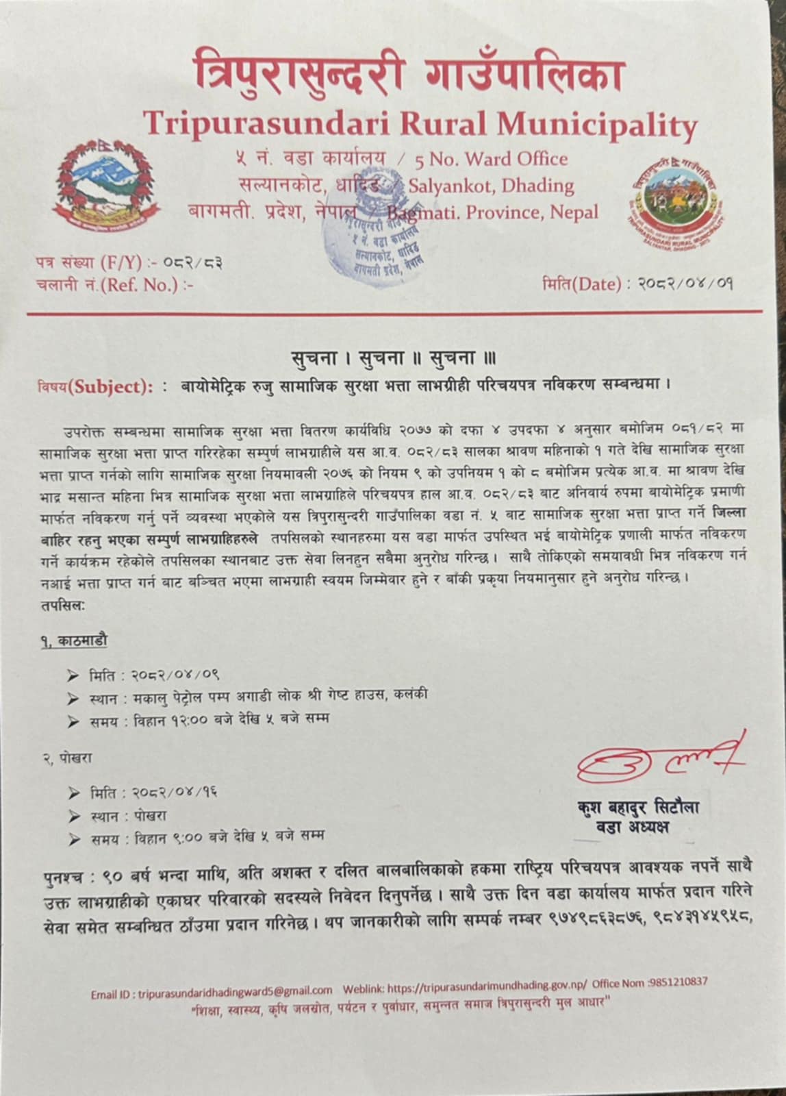 धादिङ । त्रिपुरासुन्दरी गाउँपालिका–५ बाट सामाजिक सुरक्षा भत्ता प्राप्त गर्दै आएका लाभग्राहीहरूलाई आर्थिक वर्ष २०८२/८३ को लागि अनिवार्य रुपमा बायोमेट्रिक प्रणालीमार्फत नविकरण गर्नु पर्ने भएको छ।