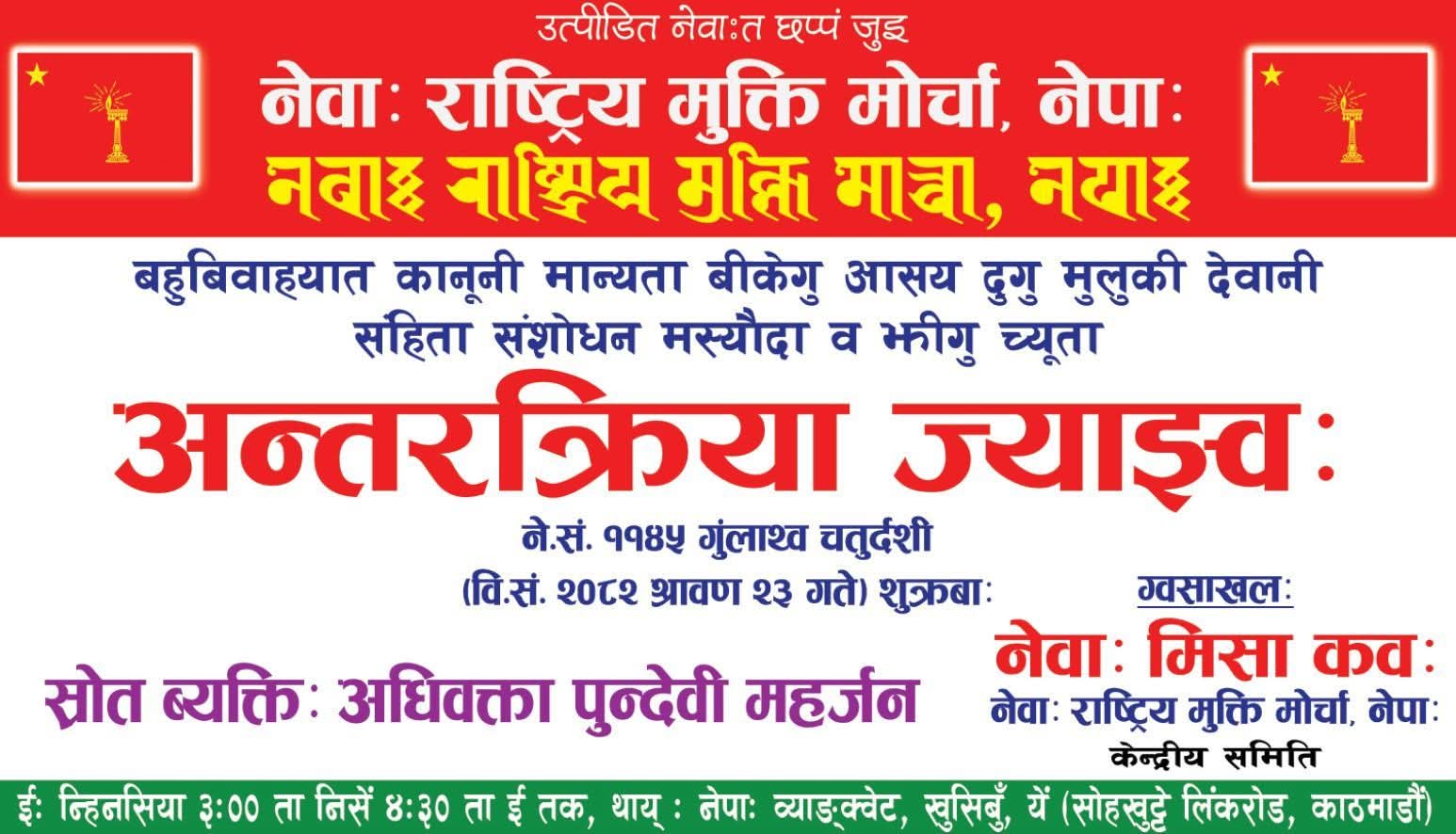 काठमाडौं । नेवा: राष्ट्रिय मुक्ति मोर्चा, नेपा : ( नेवाः राष्ट्रिय मुक्ति माचा, नेपाः) द्वारा आयोजित अन्तरक्रिया कार्यक्रम आज काठमाडौंको व्याडकटे, खुसिबुमा सम्पन्न भएको छ। कार्यक्रमको उद्देश्य बहुविवाहसम्बन्धी कानुनी मान्यता, मस्यौदा, सुधार र प्रभावबारे छलफल गर्नु रहेको थियो।