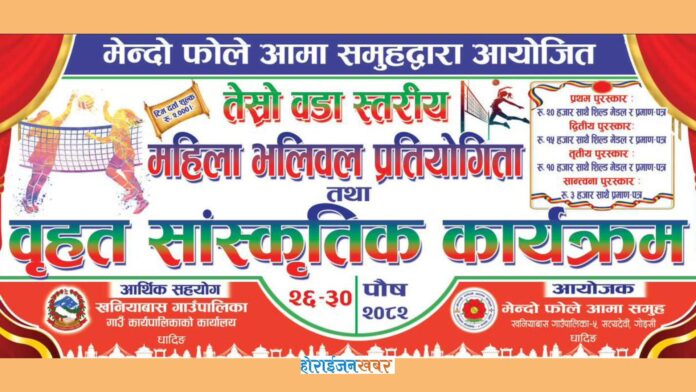 धादिङ । मेन्दो फोले आमा समूहको आयोजनामा धादिङको खनियाबास गाउँपालिका–५, सत्यदेवीमा तेस्रो वडा स्तरीय महिला भलिबल प्रतियोगिता तथा वृहत् सांस्कृतिक कार्यक्रम सञ्चालन हुने भएको छ।